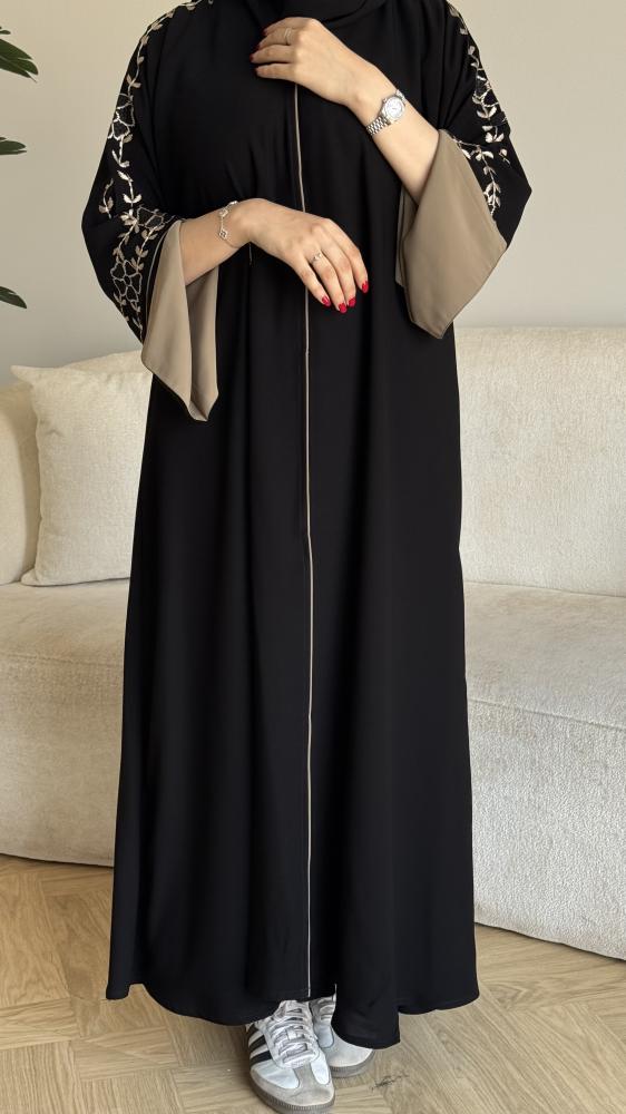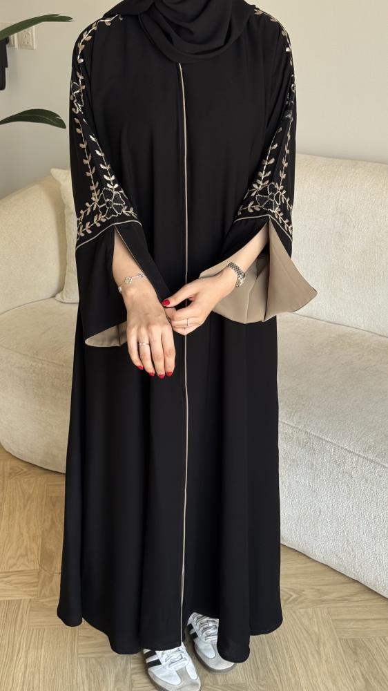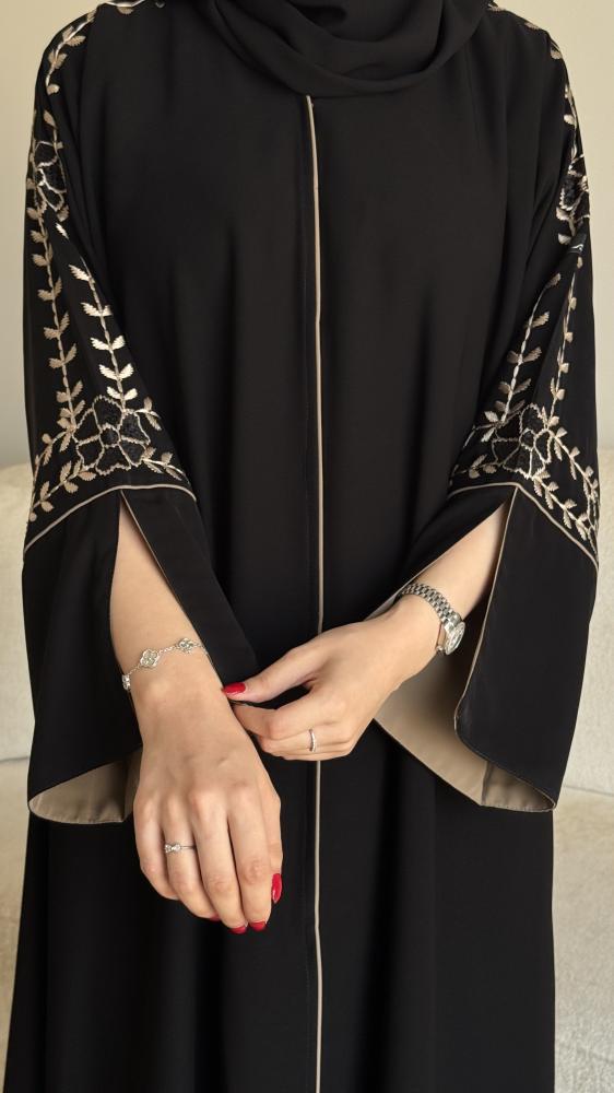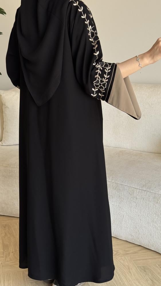 • أكمام مطرزة بتفاصيل أوراق وزهور أنثوية أنيقة.