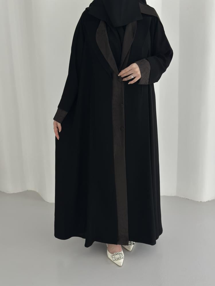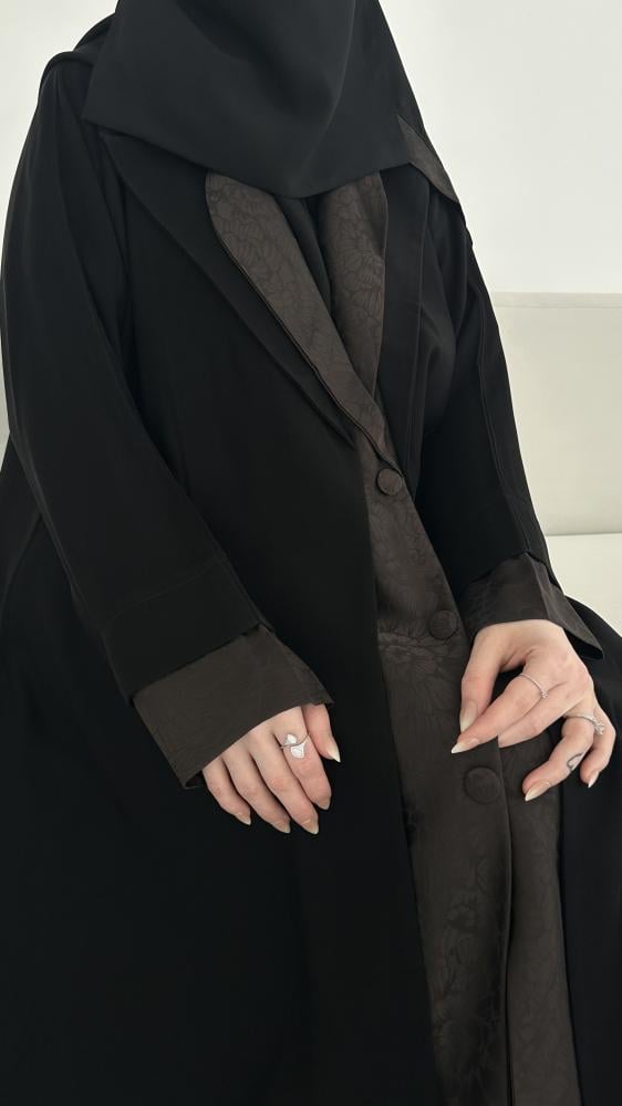 راقية بخامة كريب ملكي ناعم تنسدل بانسيابية فاخرة، وتتميّز بتفاصيل من الجاكار الياباني المزخرف على الحواف، تضيف لمسة فنية أنثوية وعصرية.