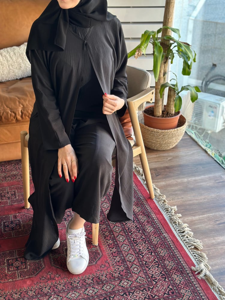 عباية السفر تتميز بلون الأسود جذاب بقصه ميد هرميه من الأسفل , قماش ( CY ) من اللينن الخفيف الصيفي المُميز , الكمية جداً محدودة.