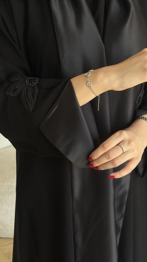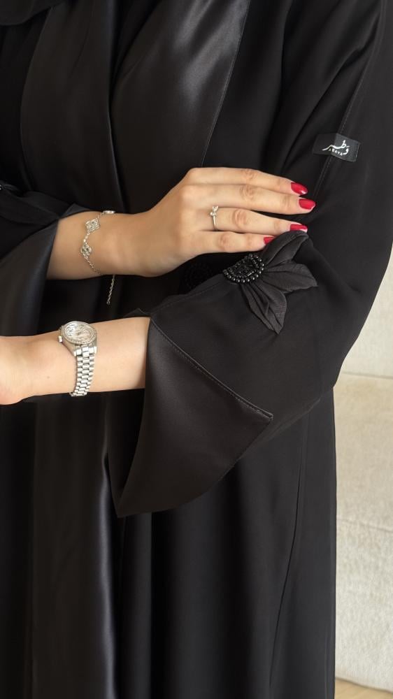 تزيين العباية جاء بتفاصيل ورد ناعم على الأكمام وأسفلها مع خرز أسود أنيق، ليضيف لمسة رقي تليق بذوقك العصري.