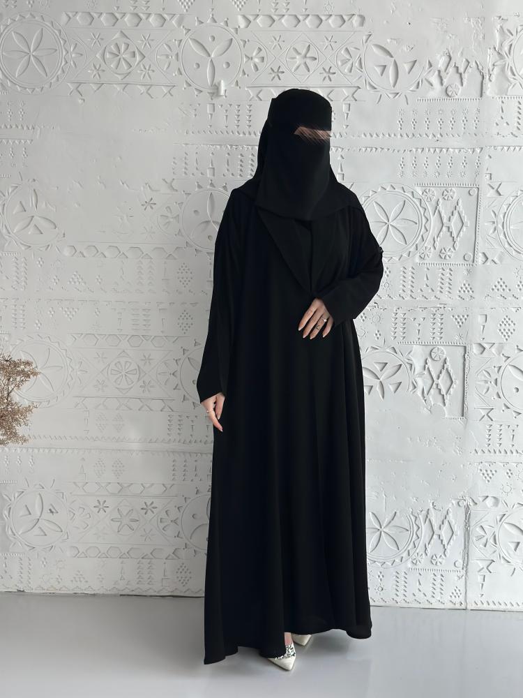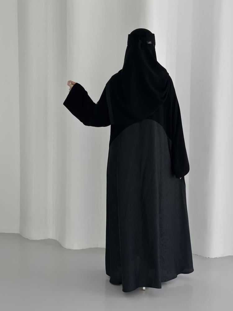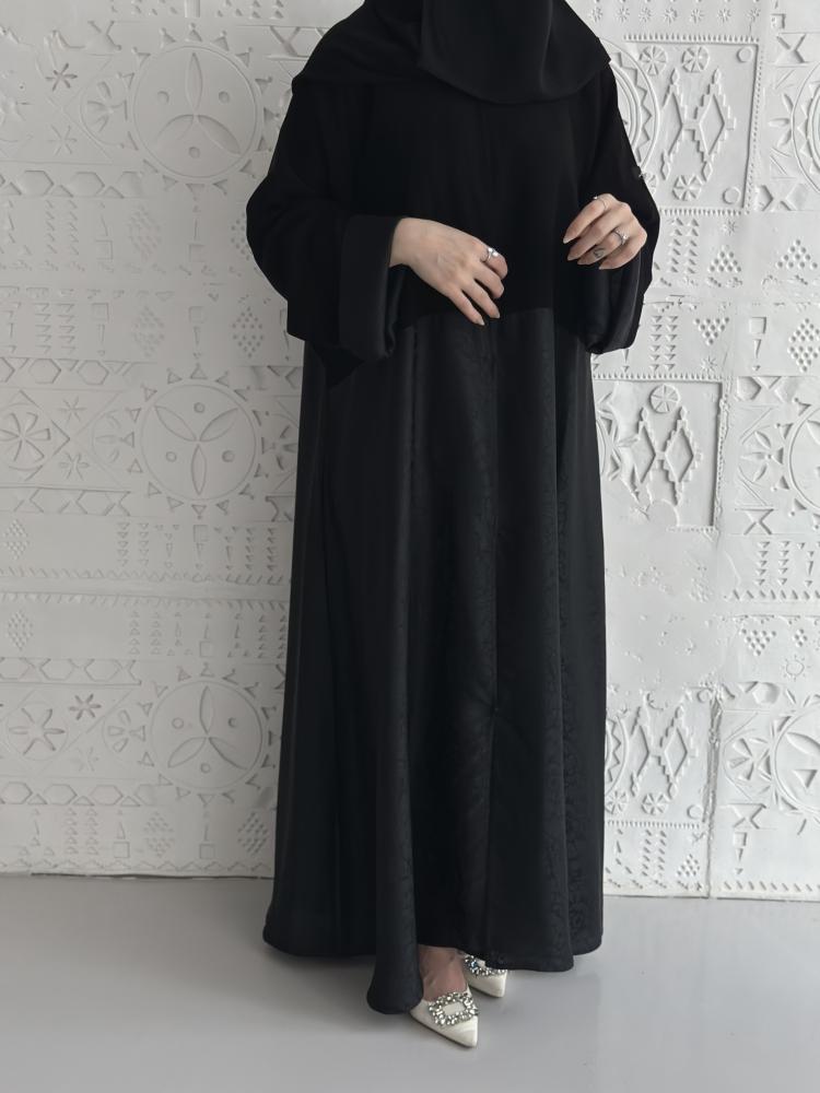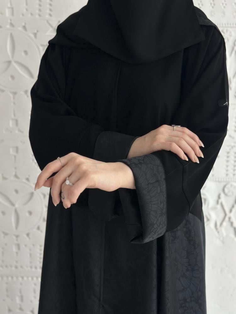 راقية بخامة كريب ملكي ناعم تنسدل بانسيابية فاخرة، وتتميّز بتفاصيل من الجاكار الياباني المزخرف، تضيف لمسة فنية أنثوية وعصرية.