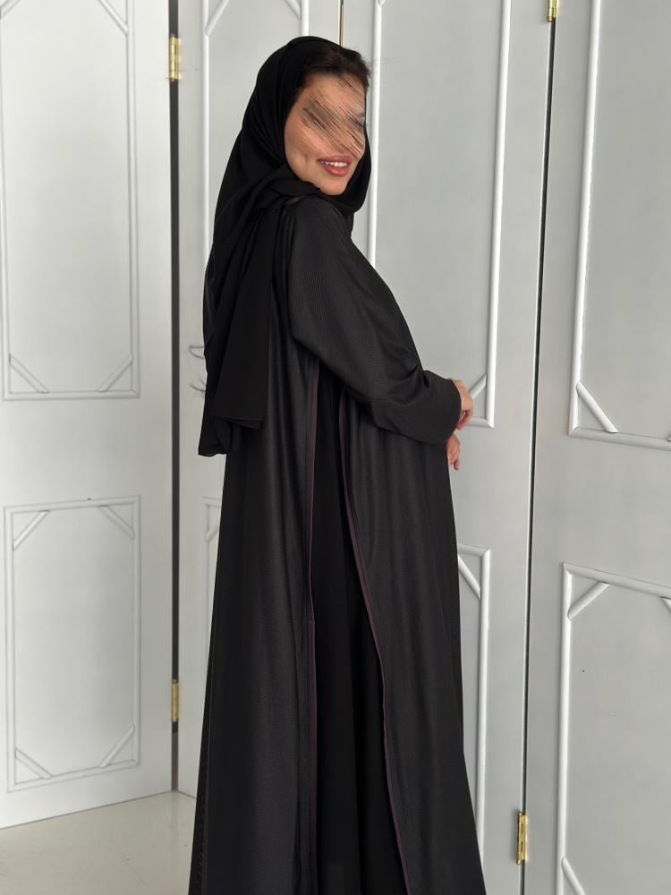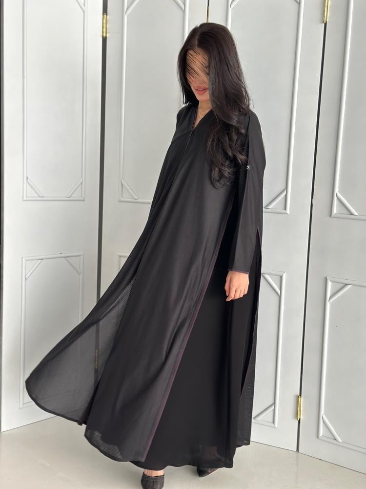 عباية تجمع بين الفخامة والنعومة، مصممة من قماش “إنترنت” المعروف بملمسه الفاخر ومظهره المميز، مع لمسات شفافة من قماش التل تضيف لها أنوثة راقية وحضور أنيق.